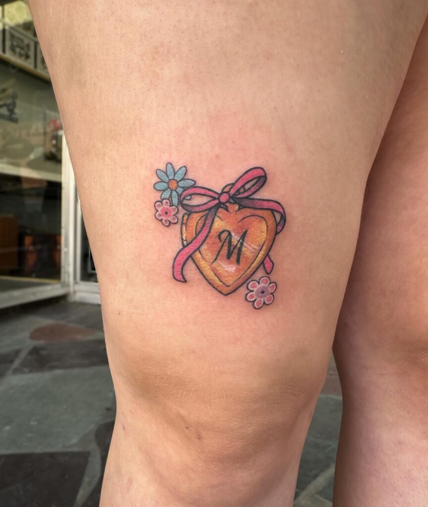 This colorful tattoo features a golden heart adorned with a pink ribbon, delicate flowers, and the letter “M” at its center. It blends femininity, personalization, and charm, making it a sweet tribute to a loved one whose initial holds deep significance.