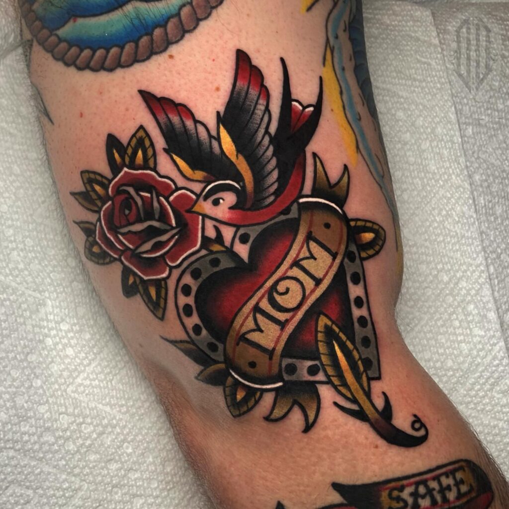 This tattoo embraces classic American traditional style with bold lines, vibrant colors, and timeless motifs. A red heart with a gold banner reading “MOM” is surrounded by a rose and a bird in flight, symbolizing eternal love, devotion, and family bonds.