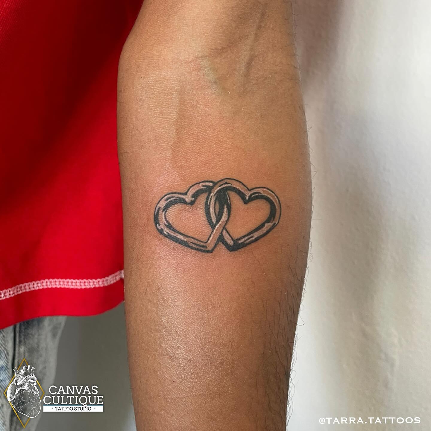 The interweaving of the hearts suggests balance, harmony, and inseparability. Placed on the arm, it is highly visible and personal, showing devotion openly. This tattoo carries both aesthetic charm and deep emotional resonance, making it an ideal tribute to lasting relationships or partnerships.