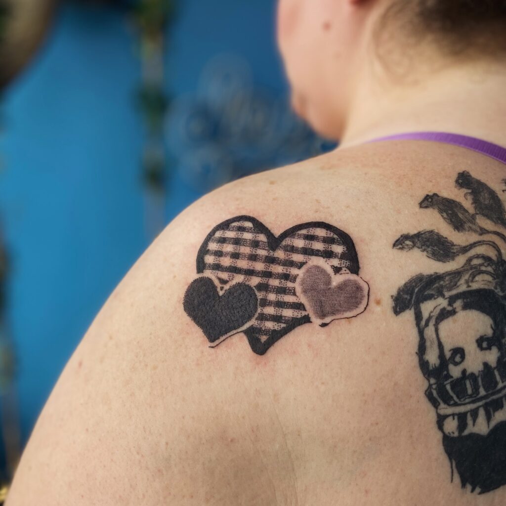 This tattoo showcases three textured hearts on the shoulder, with the largest patterned like fabric and two smaller hearts overlapping it. The patchwork effect creates a cozy, homespun feel, suggesting themes of comfort, healing, and togetherness. It can symbolize love stitched together from different experiences, or the bonds formed through resilience.