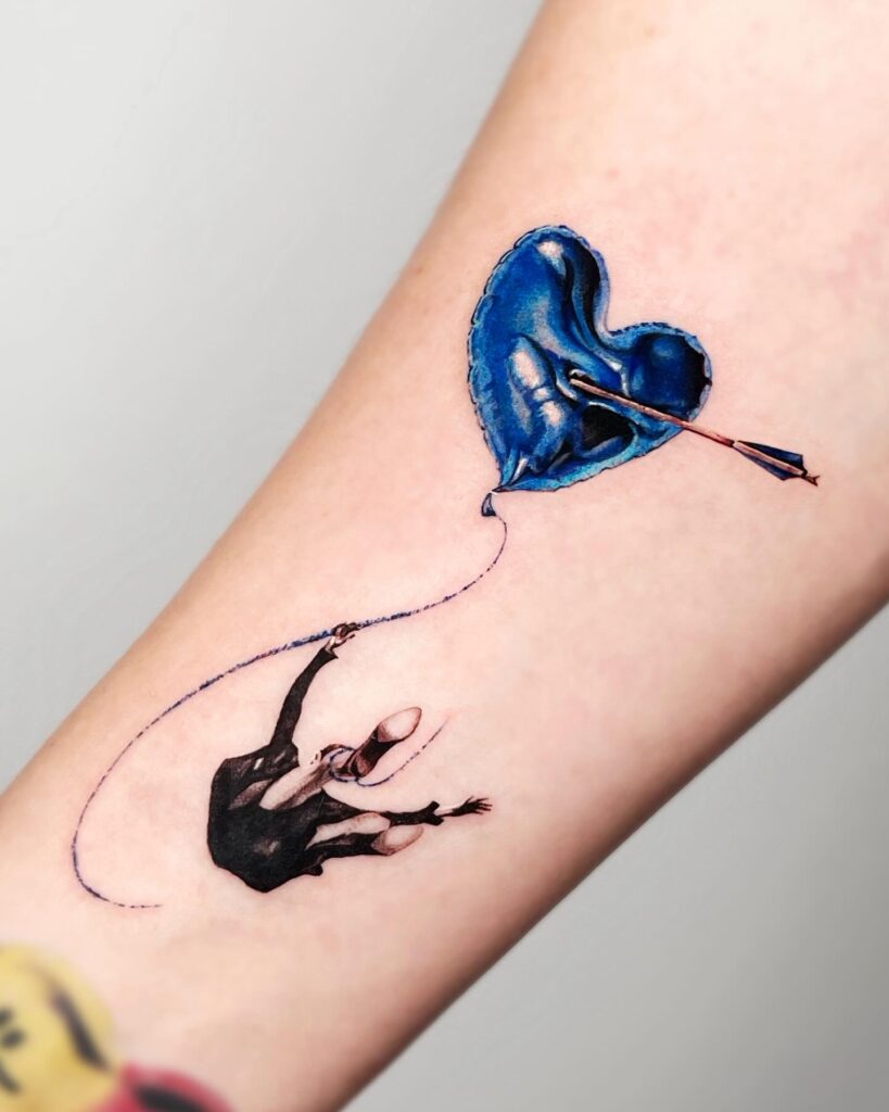 This creative design features a shiny blue heart-shaped balloon pierced by an arrow, with a figure suspended below, holding onto the string. The balloon, often associated with innocence and fleeting moments, contrasts with the arrow—symbolizing love struck, vulnerability, or heartbreak.