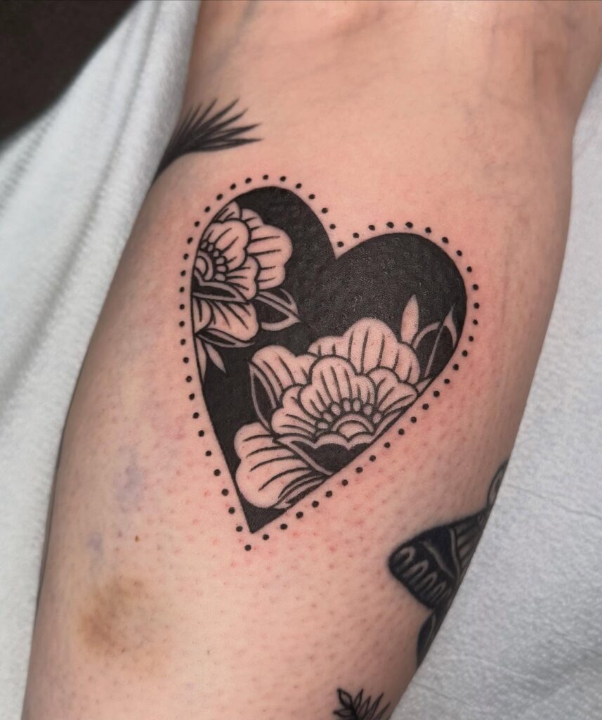 This striking tattoo features a blackout-style heart, filled with dark ink, contrasted by delicate floral patterns carved within. The flowers bloom out of the darkness, representing resilience, hope, and beauty that thrives even in shadowed times. The dotted border adds refinement, framing the design like a piece of art.