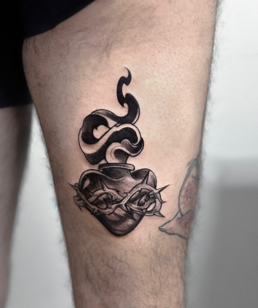 The thorns emphasize struggle and endurance, suggesting pain intertwined with love or faith. Placed on the thigh, it’s a powerful design that blends religious iconography with a gothic, modern twist. This tattoo resonates deeply with themes of resilience, inner fire, and the burning intensity of love and belief.