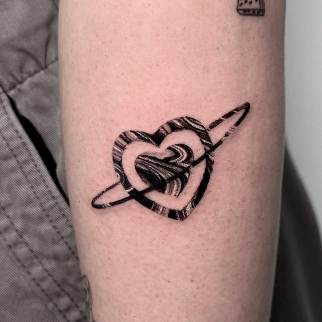 This imaginative tattoo depicts a heart encircled by a ring, resembling a planet with its orbit. The swirling patterns inside the heart enhance its cosmic aesthetic, suggesting vastness, mystery, and infinite love. It symbolizes how love can feel universal—boundless, expansive, and full of energy.
