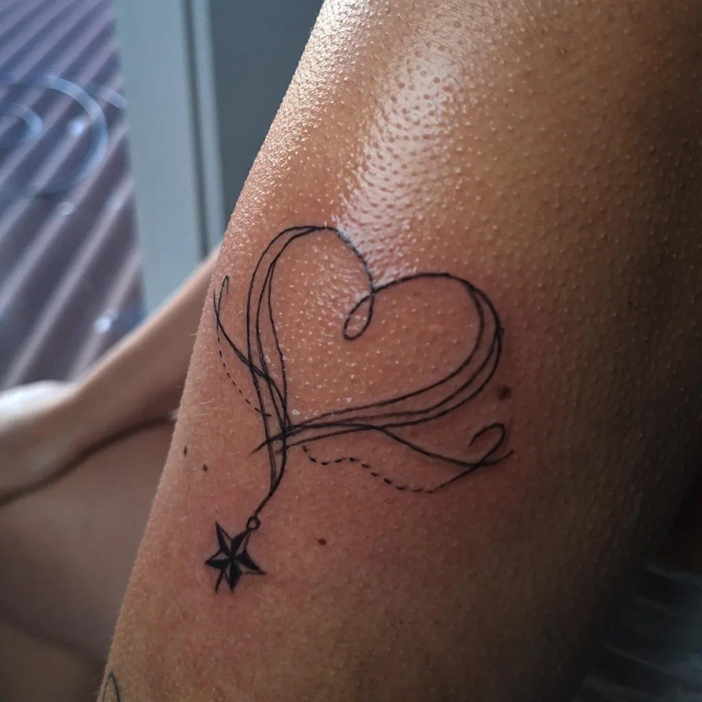 This elegant linework tattoo features a flowing heart design with trails resembling ribbons or stardust, ending with a small star. It embodies freedom, dreams, and destiny, with the star serving as a guiding light. The airy, whimsical strokes make the heart feel dynamic, almost as if it’s floating or dancing across the skin.